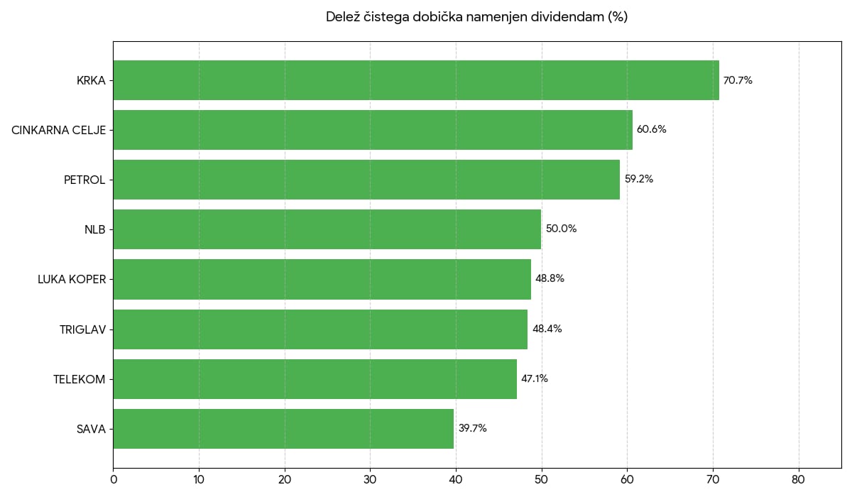Seveda sama višina dividende ne pove veliko. Pomembnejša informacija je kakšen delež čistega dobička v letu 2024 so posamezne družbe namenile delničarjem. Stolpec “dobiček” predstavlja čisti dobiček delniške družbe leta 2024 v mio EUR. Stolpec “dividende” predstavlja višino sredstev namenjenim dividendam v letu 2025, v mio EUR. Stolpec “delež” prikaže kakšen odstotek čistega dobička so družbe namenile dividendam.
