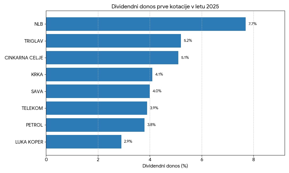 Vsekakor je bilo leto 2025 rekordno leto izplačanih dividend. NLB je spet izplačala rekordno dividendo, in glede na njihove cilje, to nameravajo nadaljevati vsaj do 2030. Krka ima že nekaj let stabilen dividendni donos (4-5%). Pozitivno je vsekakor presenetila Cinkarna Celje ki se po državni pomoči počasi postavlja na noge.